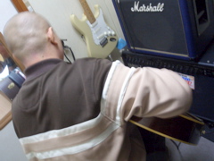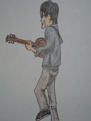 先日セッションをしたという記事を書いて、セッション中にA君が絵を描き始めたというぶっ飛んだエピソードがありましたが、、 どうやら、その絵が完成したようです!写真をアップしてみました。 僕がギターを弾いてる後ろ姿を書いてくれてます。どうですか?似てますよね?? ご意見ご感想は、E-mailまたはBBSでどうぞ!