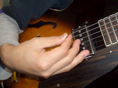 先日取り付けたピックガードのおかげで随分前からトライしていた逆アングルのフォームでの演奏がズムーズになりました。小指をピックガードに置くことでがっちりと軸が出来、安定感が得られるのです。この逆アングルにしたことでピックの当てる位置、角度などが大幅に変わり、音色も前より暖かくシャキッとした感じになると自分では思っているのですが、的確に当てるのがなかなか難しい、、んでもってなれないフォームなので最初はすぐ手が痛くなる、、、今では随分自然に構えられるようになってきました。。まだまだ修行が必要です!