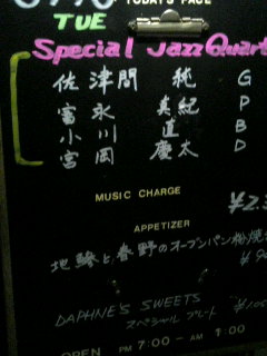 今宵は鎌倉のダフネで『佐津間純カルテット』のライブでした♪ メンバーは佐津間純(g)、富永真紀(p)、小川直(b)&宮岡慶太(ds)! いやぁ〜楽しかったっす!今日は音回りが凄く良くて演奏しやすかったです。 ご来場のお客様ありがとうございましたm(__)m セカンドセットにベテランのテナーサックス奏者『今津雅人』さんが飛び入りしてくださいました! さてさて、またこのメンバーで7月19日に鎌倉ダフネで出演します♪ 次回はスペシャルゲストにニューヨーク在住の素晴らしいアルトサックス奏者の『山田拓児』さんを迎えます!!凄く楽しみです!乞うご期待♪ 2007.5.15[Tue]