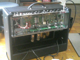 先日、真空管を取り替えたばかりの『Hod Rod Deluxe』にノイズが発生! 基盤のなかの何かが振動し『ガタガタ』という音がします。いつも使っているメインアンプなので慌ててDr.ゆうたのところへ持って行きました。