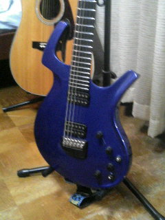 僕の自宅にいつも熱心にレッスンに通ってくる生徒Yさんはいつもは『Land Scape』という立派なフルアコを持っていらっしゃるのですが、今日は不思議なギターで参上!『Parker』というギターでとっても薄くて軽い21世紀型ギター♪使用されている材も木ではないそうで、なんとかファイバーっていう科学繊維?!でで来ています。色も青でなんかスポーツカーみたい♪ちょっと面白かったので写真を撮らせてもらって日記のネタにさせて頂きました!