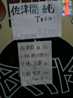 ↑上の字読めます?? 『かきがらちょう』って読むんですが、、、。 日本橋にある地名です。東京のこの辺って読み方が難しい地名が多いですよね。 ひょっとして読めないの僕だけかなぁ〜?? 今宵はその日本橋の『かきがらちょう』に出来たバー『PURANABARCA(プラーナバルカ)』というお店のプレオープンのイベントで演奏しました♪ とっても素敵なバーでちょっとニューヨークを彷彿させるお洒落なバーでした! 今日のメンバーはいつも一緒に演奏しているベースの小林こうたろう君とニューヨークから帰国したばかりのトランぺッター谷殿明良(たにどのあきら)くん。 あきらくんとはバークリーのとき以来2、3年ぶりに一緒に演奏しました。 とっても楽しく演奏できて、嬉しかったです! 2007.10.5[Fri]