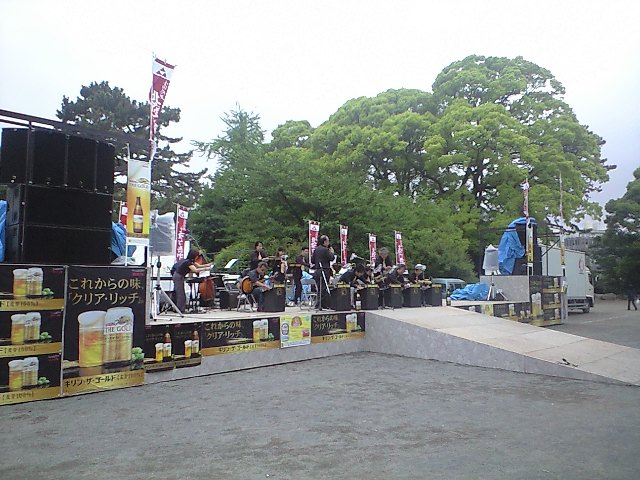 今日は朝から小田原へ! 「小林新作グループ」で小田原城の公園内でのジャズのイベント。 雲行きのあやしい中セッティング…。今日はジャズフェスみたいな感じでいくつかバンドが出演するので、ギターの寺屋さんやベースの江上さんなどミュージシャン仲間もぞくぞく集結♪楽しくなりそうな雰囲気♪心配事は野外のイベントなので、天気が心配…。案の定、降ってきましたよ…。少し機材もぬれちゃって気分はどんより…。演奏はすごく楽しかったけど、雨さえ降らねばもっと楽しめたのになぁ〜。