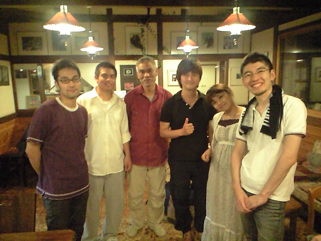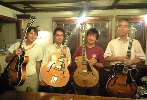 写真は左から、僕(g)、大地くん(オーナーの息子さんでドラマー)、オーナの己繁さん、フミトさん(as)、アリサ姉さん(p)、マコッちゃん(ds)んで、映ってないんだけど撮影してくれたのがMy buddy小林航太朗(b)くん!