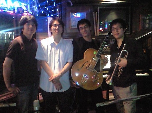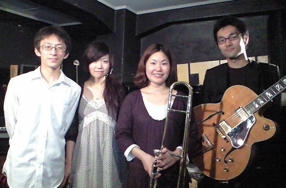 上杉優カルテット初ライブでした! メンバーは上杉優(tb,vo)、佐津間純(g),黒瀬香菜(org),永山洋輔(ds)。とってもハッピーでご機嫌なライブでした! ご来場のお客様ありがとうございました♪ 写真は永山ds、黒瀬org、上杉tb、佐津間g 2009.7.2[Thu]