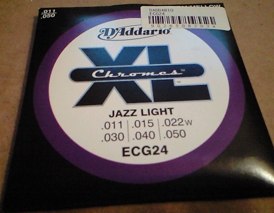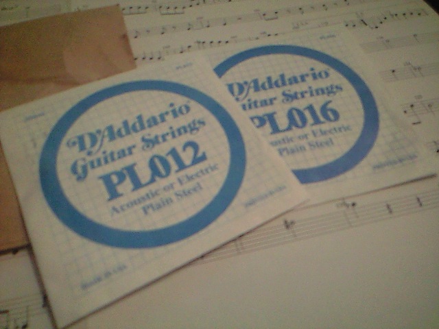 弦の話です。 普段は0.11〜のダダリオのセットを張っています。今日は1,2弦だけ交換♪ちょっと太めの弦を張ってみました!0.12と0.16のダダリオ♪ちなみに、弦の下に写っている譜面は近々レコーディング予定のベイギターズの譜面…。がんばらねばっ!!