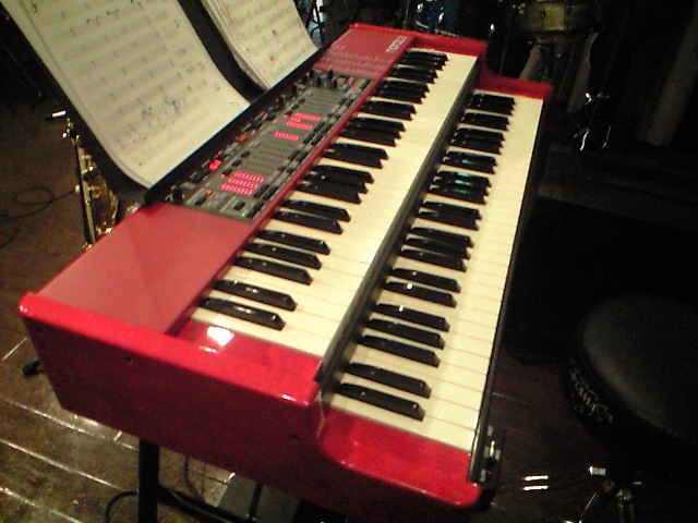 昨日のライブは赤いオルガンが初登場! オルガンの黒瀬香菜ちゃんのニューパートナー『Nord』!! とてもきれいな赤で見た目もかわいらしい楽器です! しかも、すごく綿密にハモンドオルガンの音が再現されててとっても良い音してまして、ますますオルガントリオのサウンドを分厚くしてくれそう♪来年も楽しみですな!! ちなみに、アンプもレスリースピーカーをモデリングしたアンプ♪ 2009.12.28[Mon]
