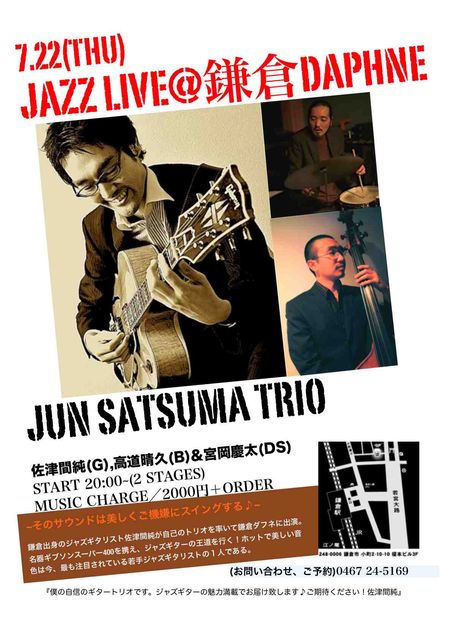 今週の木曜日に鎌倉ダフネにて僕のトリオでライブをいたします♪♪お時間ございましたら、ぜひぜひ足を運んでください! ☆7月22日(木)@鎌倉ダフネ 『佐津間純TRIO』 佐津間純(g),高道晴久(b)&宮岡慶太(ds) 演奏開始20:00〜/21:30〜チャージ2000円 •久々に地元鎌倉ダフネに出演です♪ 素晴らしいメンバーでお送りします!ぜひ、ご予約を!! お店HP→http://jazz-daphne.jp/main.html 2010.7.18[Sun]