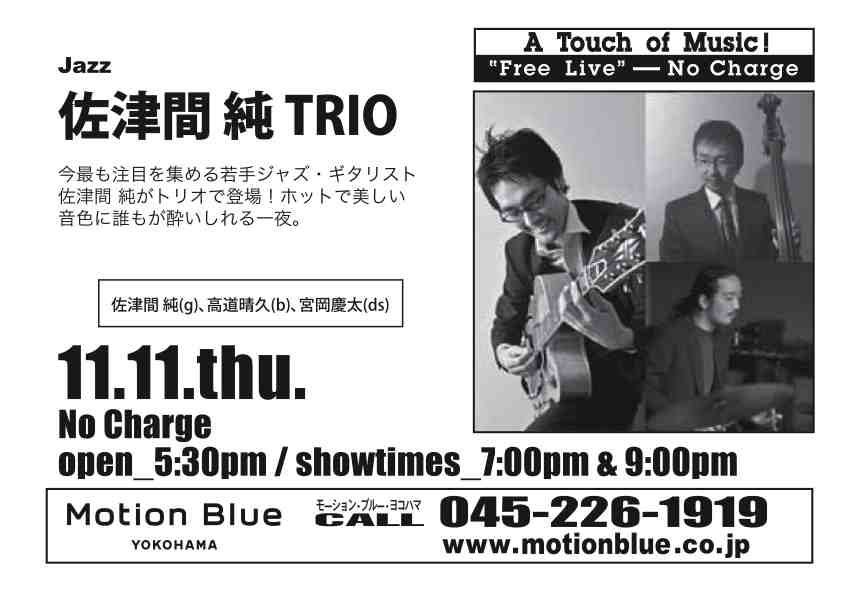 早いもので今年も残り2ヶ月!! 今月は… ☆11月11日(木)@赤レンガ倉庫内『Motion Blue Yokohama』 『佐津間純Trio』 佐津間純(gt),高道晴久(b)&宮岡慶太(ds) 19:00〜/21:00〜 チャージ無料!! 詳細はコチラ→http://www.motionblue.co.jp/ 〜ホットで美しい音色でジャズギターの王道をいく若手注目株のギタリスト、佐津間 純。軽やかで心地よい時間が流れるミュージック・チャージ無料ライヴ。〜 ※佐津間純Trioでモーションブルー横浜に出演します!! チャージは無料です!会場もメチャメチャ広いので、たくさんの方にお越しいただければと思っています♪ぜひ、ご予約を! 2010.11.1[Mon]