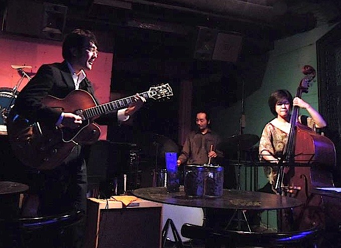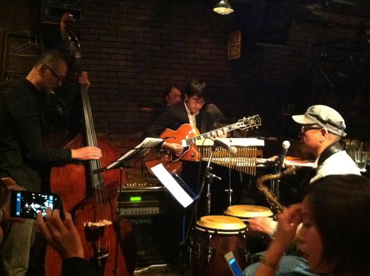 今宵は、小暮哲也氏とデュオ@モンゴメリーランドでした♪ たくさんのジャズギターファンの方に囲まれて、楽しく演奏させていただきました♪♪ご来場ありがとうございました! なんと、菅野義孝氏が遊びに来て一曲飛び入りしてくださいました♪そして若手ジャズギタリストの貫井雄一くんも飛び入りしてくれました!ジャズギターって楽しいなぁ〜♪そんな夜でした! 写真は左から、菅野さん、貫井くん、小暮さん、佐津間。 次回は… 11/11アルトサックスの菅野"ポール"浩さんとデュオで出演いたします♪ジャズギター好きの集まる素敵なニュースポット!池袋『モンゴメリーランド』をどうぞよろしくおねがいします♪ HP→http://www.mlpl.jp/montgomery/index_pc.html 2011.10.27[Thu]