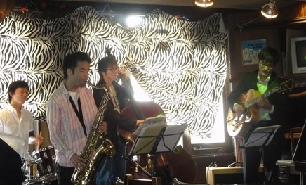 小田原スパッツに出演でした。今宵は初の顔合わせのメンバーで、リーダー小林新作さん(b)、長谷川明彦さん(ds)、森田修史さん(ts)。初共演でしたが、とてもバランスの良いアンサンブルになりました♪ご来場くださった皆様ありがとうございました。 2011.10.3[Mon]