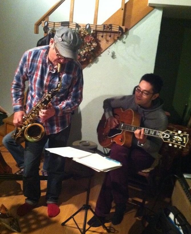 今宵はアルトサックスの菅野浩さんとデュオ。初共演でした♪ 菅野氏の暖かく優しい音色、そして人柄に感激した夜でした♪ ギタリストの佐々木慧さんが飛び入りして下さいました♪慧さんのギターもとても良い音色で、しかも7弦ギター!はじめて7弦ギターのサウンドを聴きました♪ご機嫌でした♪ ご来場くださいました皆様ありがとうございました! 2011.11.11[Fri]