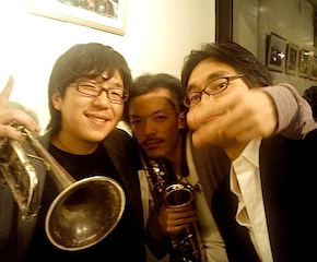 打ち上げの席にて♪ 素晴らしい仲間と一緒に演奏できて、ホント幸せ! 左から… 谷殿明良(tp)→http://ameblo.jp/atanidono/ 原川誠司(as)→http://ameblo.jp/seijiharakawa/ 佐津間(g) 2012.5.15[Tue]