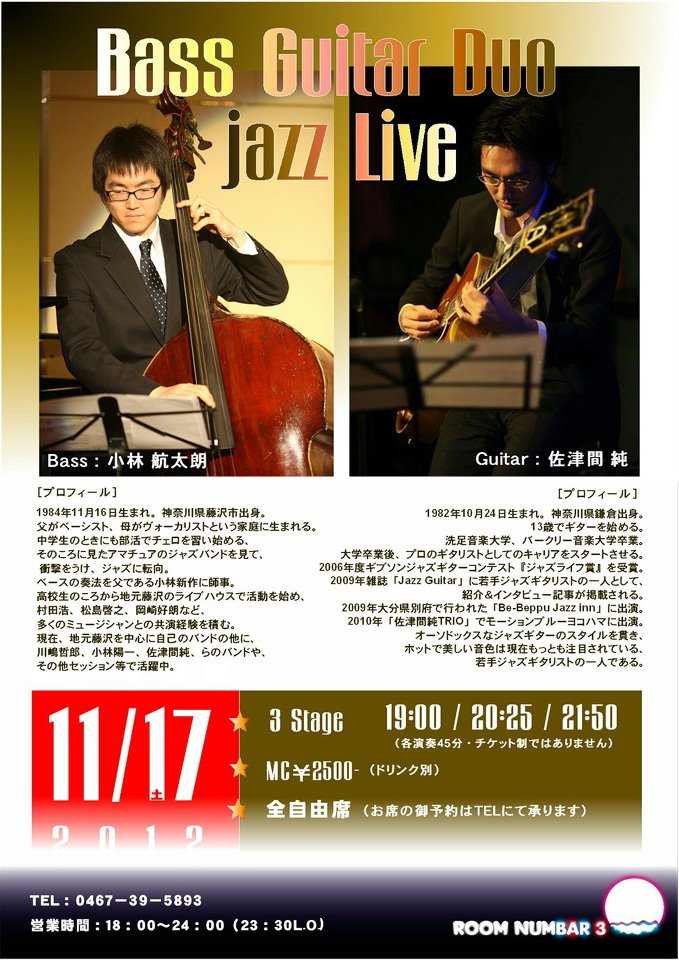 藤野めぐみさんのグループでジャズライブハウスの老舗、吉祥寺サムタイム(昼間の部)に出演しました♪メンバーは藤野めぐみさん(vo),若林美佐(b),佐津間純(gt)。藤野さんのファンの方や生徒の方など、その他ホントにたくさんの方にご来場いただき熱心に耳を傾けていただきました♪ありがとうございました。 夜はこちらも老舗、新宿『J』にて『大江陽象(ds)グループwith雪丸美歩(vo)』。メンバーは大江陽象(ds),矢藤亜沙巳(p),千北祐輔(b)&佐津間純(ds)。大江さんも雪丸さんも九州の出身というつながりから今回のライブが実現したそうです。ちなみにピアニスト矢藤亜沙巳さん、ベースは千北祐輔くんは関西出身♪ 2012.11.24[Sat]