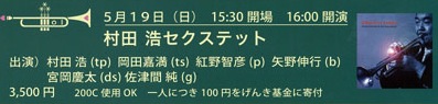 5/19(日)村田浩セクステット・ジャズ・ライブ 「ハスキーズギャラリー」 出演: 村田浩(トランペット) 岡田嘉満(テナーサックス) 紅野智彦(ピアノ) 矢野伸行(ベース) 宮岡慶太(ドラムス) 佐津間純(ギター) 開演16時〜/料金3,500円 2013.5.18[Sat]